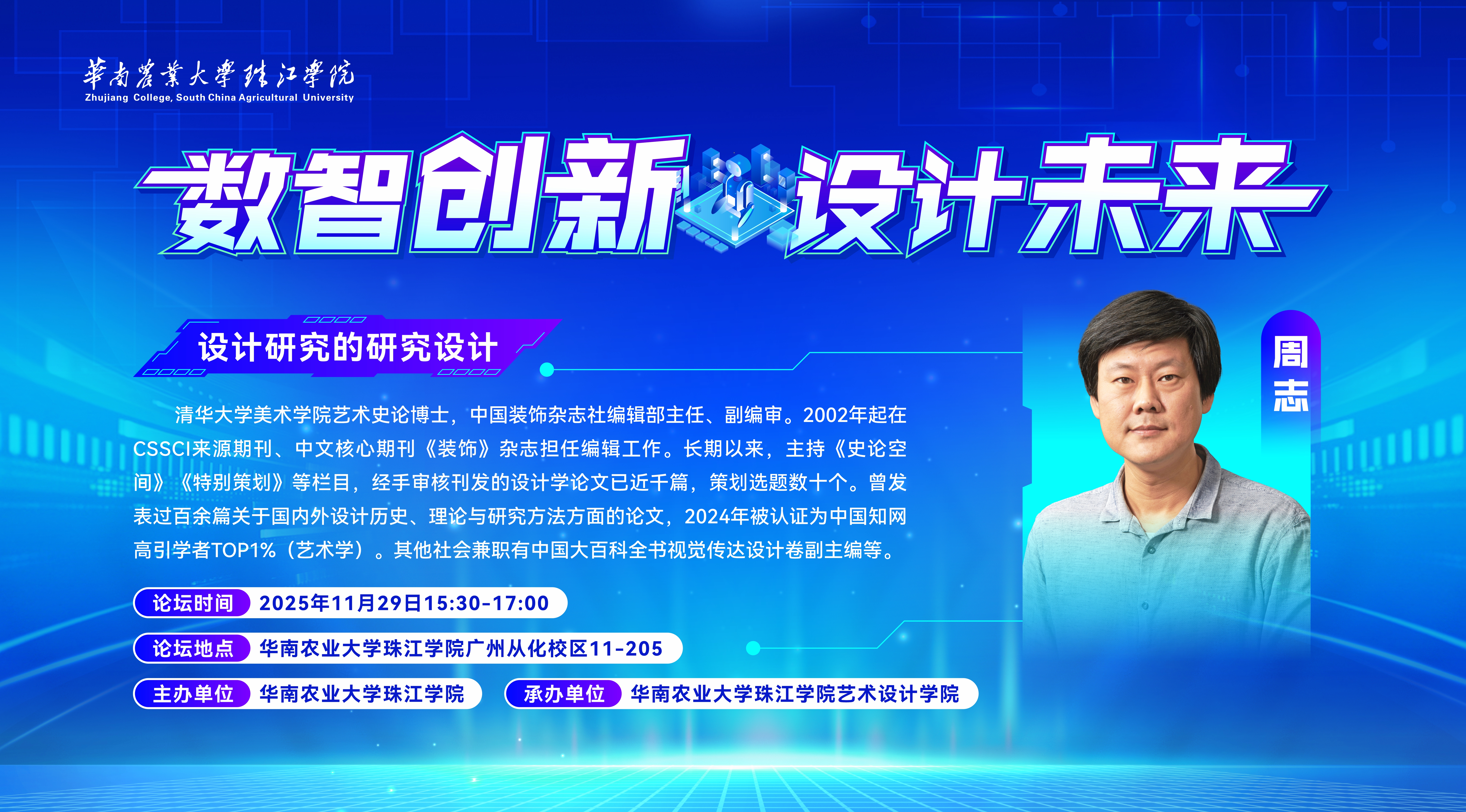 此次学术讲座由艺术设计学院院长何新闻教授主持,北京电影学院张杰教授、艺术设计学院党总支书记林小慧、办公室主任赖超文、刘培艳等教师及学生代表参加了此次讲座。本次讲座特邀清华大学美术学院艺术史论博士、中国装饰杂志社编辑部主任周志担任主讲嘉宾。周志凭借其丰富的编辑经验与深厚的学术积淀,围绕“设计本质、研究逻辑、选题路径、文献运用、方法选择及《装饰》杂志栏目解析”六大核心主题展开深度讲解。
